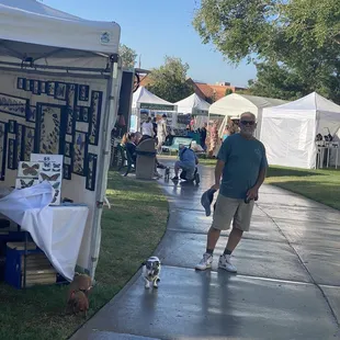 10-2-22 Spotting white tents on our way to breakfast in Boulder City we knew something fun was about to take place. I said loudly CRAFT FAIR!!!Doc looked it up and told us Art In The Park. We also saw a poster: 100 vendors - that confirmed it: if you can't see long horn sheep you might as well add some local culture while we are here.After breakfast at the Coffee Cup and still no sight of the herd, we found lot parking. Half an hour too early but I spotted someone making a sale.Let's do this! The plan was stay on the paved walkway through the park with benches nearby in case we needed to take a break.I bought handcrafted bracelets for Doc and myself. Doc bought hubs a stake with a metal dog hunching over. There is an unidentified dog walker who never picks up their business by our sidewalk.There were many tiny cute four legged family members visiting too. Okay let's hele on...that was a nice diversion.Many artists even from Arizona.Huge paintings, sculptures, woolen shawls and more. I need to get on their mailing list.