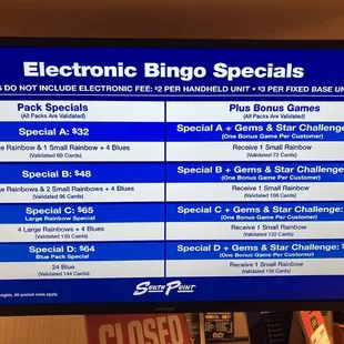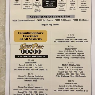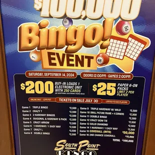 4.5 stars: This was my first time playing at South Point. I usually play at Stations, and miss Fiesta! Big room, well kept, 2 free drinks with minimum buy in.Quick Summary: If it's your first time here, don't do paper (it's too complicated). If you don't mind spending the extra money, pay for the gem and star games. When they pay it's a lot. Look at the session information so you understand the games for that time slot.The first game each session is triple bingo. If you are new, I'd advise using an electronic machine so it can daub for you. Some sessions have THREE $1000 coveralls! Staff are efficient but not super helpful in explaining how to play for newbies. It took me 3 sessions to understand the gem and star games-so I won't try to explain here.