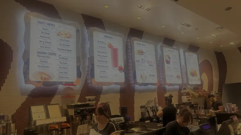 Their breakfast crepes are disgusting, processed mush and inedible. The example photo they display on their menu shows fresh, whole eggs, over easy, wrapped in quality sliced ham. Instead, they substitute real food with fake, processed in a factory "scrambled eggs" and dog-food like small cubes of processed "ham". I asked for a side of their hollindaise sauce, in an attempt to make it more edible, but it was still horrible. With tax and tip, I paid $25 for inedible factory-made mush. There's an omelet station around the corner. Go there instead.MGM should be ashamed for allowing their vendors to swindle their hotel guests.With that said, the people who ordered sweet crepes (strawberries, etc.) seemed happy. But their bait-and switch breakfast crepe is most likely illegal false advertising.
