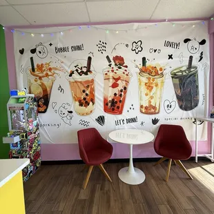 Cute place! Only 2 tables, not a place for large groups! The gentleman there was so friendly and welcoming. The prices for the drinks aren't bad. I got an iced tea with mango, boba and strawberry jelly....I will go with less sweet next time instead of standard. By the time I was almost done it was too sweet to finish. The boba was good though! I'll go back, I want to try a latte and a slush!!