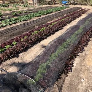Rows of Tomatoes under some shade that protects them from UV rays