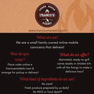 Francos is our go to for carne asada. Their meat is much higher quality than any others that we've had and the flavor is amazing. The salsas are all super tasty as well. We've never been disappointed with anything that we've purchased from them! Having 3 young kids, it's even better that they deliver it right to your door so you don't have to load everyone up! Can't wait to order from them again soon.