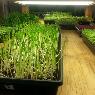 a variety of microgreens growing in trays