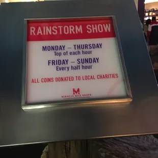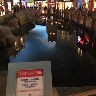 Also known as the "Rainstorm Show", you can watch it rain inside the shops at Miracle Mile. You will momentarily forget you are in the desert!Especially coming from Los Angeles where I don't often experience rain, it was great to come here to listen, feel, and watch it rain! The show starts out with fog and colored lights and is accompanied by lightning as the rain falls from the sky, I mean, ceiling! It's fun to watch and is a free experience.Show times are: Mon-Thur, top of each hour from 10:00AM to 11:00PM; Fri-Sun, every half hour from 10:00AM to 11:00PMI think it is not possible to get drenched, but you will feel sprinkles if you stand close to the ropes. Be careful walking by the area because the nearby flooring might be slippery.I had no idea, but I read this, "Before it became Planet Hollywood, this building was the Aladdin and the shopping mall was the Desert Passage". The rainstorm was a leftover feature from Aladdin. I'm glad this is still an attraction!Be sure to visit the Miracle Mile Shops and see this free falling rain show! Even the parking here is free... so there's no reason to not come experience this for yourself (unless you're from a rainy climate and want to escape rain)!!
