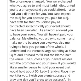 !!KEV LOVES MUSIC HALL OVER CHARGED ME andWAS THE MOST UNPROFESSIONAL VENUEOWNER EVER !!! NEVER BOOK AN EVENT THERE !!!Water dripping from the ceiling, over priced venue, disrespectful of our time, late, booked an event, had no staff, never scheduled a venue walk thru, asked me to bring my artists to soundcheck 2 days early and didn't show up to his own venue, never sent floorplan, had venue setup like a wedding reception when we were having a hip hop concert, complained when we moved furniture, then when our artists arrived they had to help him set up the venue even though when we were there hours earlier he told us we couldn't touch anything because of liability.I was charged the venue price and $500 to DJ and he did not DJ had a a person who doesn't know how to dj do the job as he worked bar, I had to host and dj and rap at my own show and lost an artist who wasn't able to perform lost crowd members because my artists performances were delayed because my venue owner literally had no understanding or care for my artists and event acted so nonchalant and moved on his own accord for an event that I put 3 billboards and a radio advertisement in town promoting my event and his venue.He overcharged me and then asked me to come merivers vecduse my druses veronidnces were delayed because my venue owner literally had no understanding or care for my artists and event acted so nonchalant and moved on his own accord for an event that I put 3 billboards and a radio advertisement in town promoting my event and his venue.He overcharged me and then asked me to come back and do a residency there with my artists and crowd, so l asked him if he could lower or wave the over charged balance I owed after I made him thousands in 1 nite with the venue fee I that I paid and the money he made off bar (watered down drinks), and he told me "Don't make him regret helping me"...... Wow!!!! merivers vecduse my druses veronidnces were delayed because my venue owner literally had no understanding or care for my artists and event acted so nonchalant and moved on his own accord for an event that I put 3 billboards and a radio advertisement in town promoting my event and his venue.He overcharged me and then asked me to come back and do a residency there with my artists and crowd, so l asked him if he could lower or wave the over charged balance I owed after I made him thousands in 1 nite with the venue fee I that I paid and the money he made off bar (watered down drinks), and he told me "Don't make him regret helping me"...... Wow!!!!------ in response to this Kevin Love guy trying to save embarrassment he is a liar and a fraud and a scammer he is not even hosting wedding and events there on the daily it is a ghost town and empty I would recommend going to mariposas across the street that is an amazing venue and has a great DJ and wonderful sound system and always vibrant and packed !!! I love that mariposa .