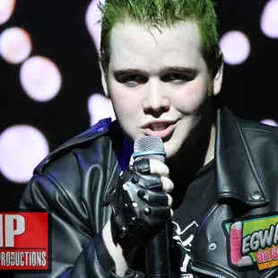 a man with green hair and a woman in a black leather jacket