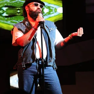 a man in a vest singing into a microphone