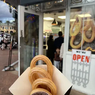I have had many churros in my life. These were on a whole other level. Wow! My son and I decided to stop by and because we were sharing we decided to get six so we could have two different sauces. He chose the Bavarian cream and I chose the caramel. They gave the little pager and it took about 10 to 15 minutes for them to be ready. They were nice and hot when we got them. They were very crisp and the cinnamon sugar didn't over flavor the churro. They were soft in the middle but not mushy and they weren't overly wide. I would say they are about half an inch wide. I was a little disappointed in the caramel flavor and wasn't expecting to really care for Bavarian cream. Get the Bavarian cream! It is incredible with the churros. These little teardrop churros are so filling. My son and I could only finish two a piece. I definitely over ordered. I decided to take them home because I didn't wanna waste them. I just knew they weren't gonna taste as good or as fresh but like I said, didn't wanna waste it. Four hours later I decided to eat another. It was still so crunchy. Listen to my video for that crunch. They were great four hours later and cold. I definitely suggest you give this place a try. It is fun and delicious. What a great treat.