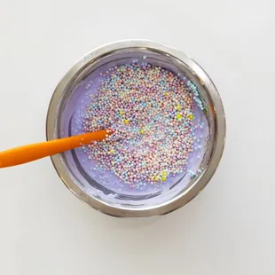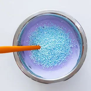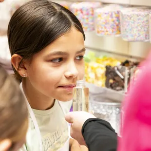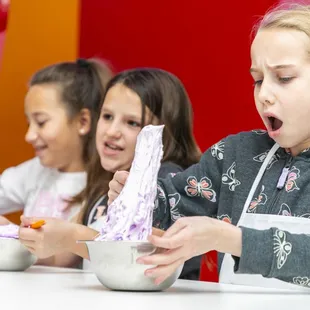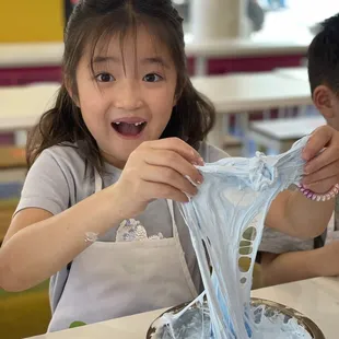 Fun place for kids. We had a playdate with our friends. Long tables, bright colors, the kids got aprons, it was set up nicely too. The heavy smell of the glue is a bit off-putting in the beginning, but it goes away as the process goes on further. Choose the colors. Add some liquid if it's too sticky to work with. Add more color if the slime isn't the right color. Your child will also get a storage canister. Very clean facility. The employees were really good, interacting with the children, with each step. They demo'ed making a bubble. The add-ons were glitter, mini figures, like a turtle, various scents, and beads. Stringbean's budget was $25.00. Very creative process. The customization is very good too. The pre-made slimes looked like candles. These were on the right side (when you walk into the store), and it looked like an ice cream shop.