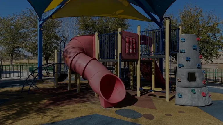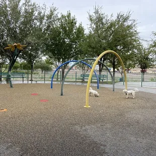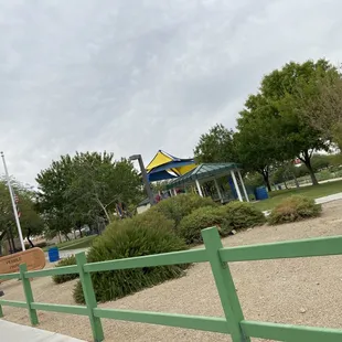 This is an OK park with a small playground. My kids had fun playing on the one small jungle gym structure, which had slides and monkey bars and things to walk under. There is also a splash pad just steps away from the playground, but because we visited during the winter, the splash pad was not on. It gets cold in the winter in the desert! Many people think that the desert is just always hot, but that's not true. So if you didn't know, now you know.I saw a lot of people walking their dogs, so I'm thinking this is a good park for doing an activity such as that. It's across the street from an indoor dog park, but there is also an outdoor dog park here. It's basically just a big, open field, but it does the job. This park seemed relatively safe, although we saw some guy who might have been homeless sitting by the bathrooms. But we also saw a few families and couples walking around. This park is located just outside of a neighborhood, so I imagine it's used by lots of people.
