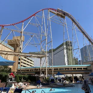 This is as basic as it gets for a pool on the Strip. There is only one pool so you got the adults, kids, and party guests all in the same pool. I'm not much of a pool guy so it was no big deal for me.Room keys are required for pool access, and they don't allow you to bring your own drinks or coolers .Lockers are at the entrance if you need to store any personal items. I only noticed about a dozen cabanas, but you can rent one without a reservation. There was no DJ but the playlist of songs were fun ranging from MJ to Drake. No complaints.There is one large bar near the pool and an amenities pool shop that has pool floats, beach balls, & umbrellas available for rent. This is basically a pool for lounging around, which was fine by me. I just put my feet in the water and took in some rays . Servers are walking around taking drink and food orders . I didn't order anything but the prices looked pretty reasonable. The Roller coaster passed overhead every 20 minutes which was kinda cool to watch, but I can see how that might annoy some. Only one Jacuzzi