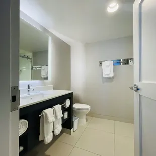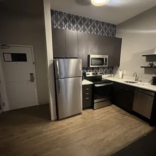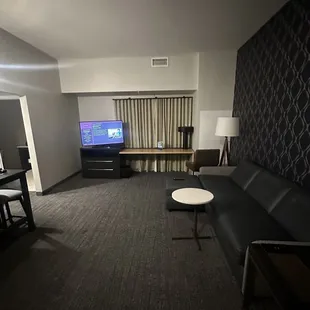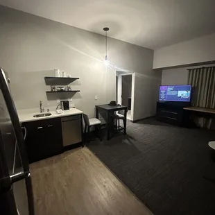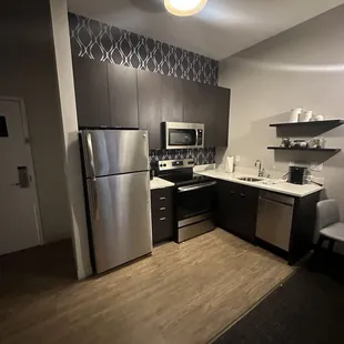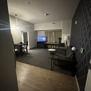 Great hotel as we traveled through Vegas. Was worried we wouldn't find a clean and pet-free hotel. They do accept pets for a fee but they remain only in the first floor rooms. The rest are pet-free which is great to avoid allergic reactions to residual pet fur. Check in was a breeze. Staff has a great sense of humor and are friendly. Room was at the end of a long hallway and was an accessible room. It was a spacious king suite. Appropriate grab bars in the bathroom for ease of use. Room was clean, the curtains were automated which was nice. Two TVs a small dining table and a full compact kitchen Overall pleased with our stay. The reviews were spot on for this hotel. Clean, modern and comfortable. Some noise outside but we are in Vegas so it's expected.