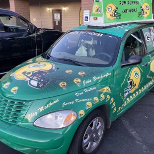a green and yellow car with a sign on top