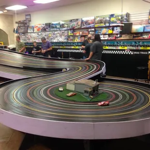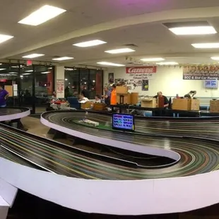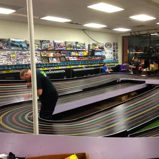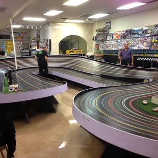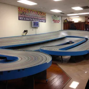 Two tracks, one beginners, with five curves and advanced track with 10 curses. Adut male entertainment! Several racing each other, both with their own equipment. The kids appear to be just as savvy and knowledgable. The guy behind the counter is constantly working on something, but friendly and helpful to get you set up. The rental cars are plastic molded flaps/winged over the axis and just two back wheels. Front is for fitting into the track. The big guys have actual full bodied cars. I can see this 'hobbie' with all of it's accompanied paraphernalia as expensive but so are most hobbies if you are a true fan!Just $5 for 15 minutes or $8 for 30 minutes for rental and such. I didn't race, but enjoyed my husband and a local kid race away the afternoon. Place is set up for birthday parties and seems to be very entertaining for all!