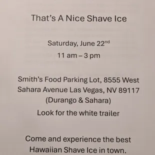 A true hidden gem! With the summer approaching we are always looking for ways to stay cool and That's A Nice Shave Ice is the perfect way to do just that! We are so excited to have found this new business. The owners are incredibly sweet, there are so many flavor options as others have mentioned and the snow cap is an absolute must! You can't beat those prices and definitely get a bang for your buck! We will definitely be back!