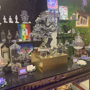 I walked in and felt a warm welcome front the sales associate and as soon as the owner came out of the back room the energy shifted. She proceeded to tell me what she does and mentions her $25 purchase. I'm no fool and I didn't bother to ask about the price of her stones. I seen a tiny singing bowl that she says sells at $75. That dang bowl with the pillow is $16.95 on Amazon. She at that point proved me right. She's a con artist. I took her business card only to see her phone number has a 646 area code. Me being Buddhist and from the 646 NEW YORK CITY, I was again proven right. She's a NYC con artist and thinks anyone that walks in her store is lost and knows next to nothing. She is a true fraud scamming the people in Vegas. I'll be back in NYC shopping peacefully.