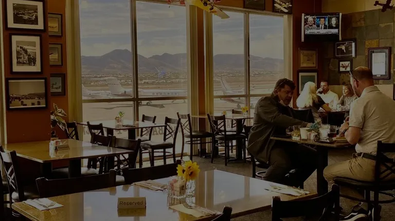 Great service and food! Thank you!! I love the view of the runway from our window table. Very cool model planes hanging from the ceiling. If you are at Henderson Executive Airport, give it a try.
