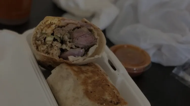 Sizzling ribeye and shrimp combination, seasoned with salt, pepper, garlic butter, soy sauce and sake, accompanied by fried rice and stir fry vegetables, tossed with spicy aioli sauce wrapped on a flour tortilla.