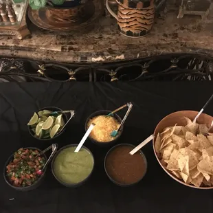 Guacamole, ceviche, red and green salsa, beans and rice, Queso and Crema