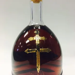 a glass bottle with a gold cross on it