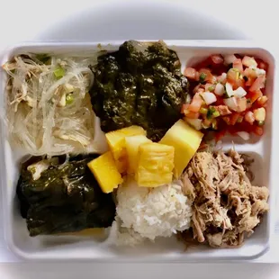 Chicken long rice, squid luau, kalua pig and lau lau