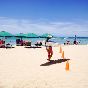 We stayed at the Moana Surfrider Hotel and right between the Moana and Outrigger hotel is Beach hut called Aloha Beach Services. Nice group of people. Family run. We rented beach chairs, umbrellas and surf boards. We got 3 surfing lessons from them! Excellent! They really take their time and instruct you. Give you confidence. Especially Kealii (surf instructor)! Excellent! JonJon also! By my 3rd lesson, I was able to catch waves by myself! Overall excellent service! You should book directly through them instead of through the hotel. Will definitely go back and use them. Cash only (no CC) But they were able to charge it to my room at the Moana.
