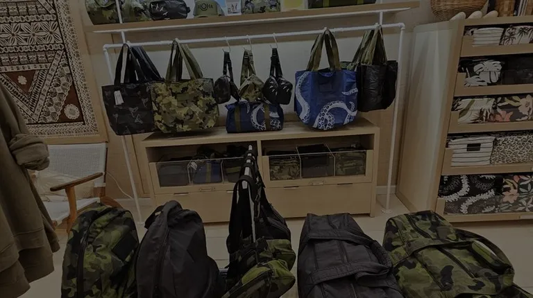 Located at Ala Moana upstairs next to Mango Mango in the Bloomingdale's wing.Most popular Day Tripper bag ($72) has a zipper and holds a lot, is waterproof, and hasn't ripped or fallen apart yet and we use and abuse ours... it's great for Hawaii. It seems $$ but it's worth it. They've added backpacks, waist bags (aka Fanny pack), cross bodies, small pouches, med pouches, and other sized tote bags. It's mostly for the ladies but they now have masculine looking prints as well.