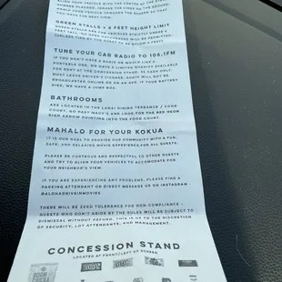 I have always wanted to go to a drive-in movie so when COVID hit and the nostalgia was brought back, I was stoked!! This one was by far my favorite of the ones that opened on Oahu. 1. You got to reserve your actual parking stall prior to the event. There were two different prices depending on where you parked: $25 and $452. They allowed you to back in your vehicle (if you reserved the appropriate stall) and have up to 5 people in your group. 3. You can bring your own food and luckily, Ala Moana is RIGHT THERE so that was super easy! This is actually why I deducted the star - the "concessions" they led us to believe on the website was nothing like what it was in actuality. It was a table with a cooler and some cardboard boxes of Costco/Sam's snacks. No food truck, no freshly popped popcorn, and no car service like once advertised (special occasion I assume)5. Although the staff wasn't the friendliest, their way of getting cars parked and out after the movie was very quick and efficient. I wish the screen was bigger and that they allowed speakers to play the sound - keeping my car running burned my gas and those who didn't needed a jump.All in all, I loved it and wish they would have kept it going!