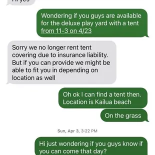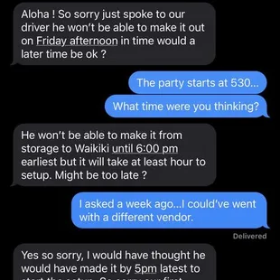 I inquired a week ago to have this company partake in my son's first birthday party and he or she said yes. I let them know that the venue needs proof of liability insurance and fast forward to today, two days before the party, he or she mentions that their driver cannot make it on time. I'm beyond annoyed and do NOT recommend any future business with this establishment. I'm assuming they don't have any liability insurance so they made up an excuse about a later start time? Regardless, no bueno!!!