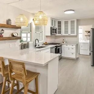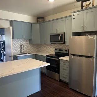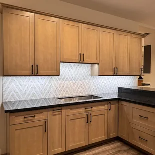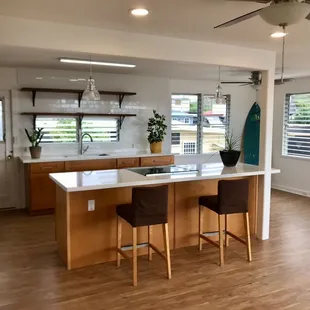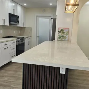 We all know that when it comes to small renovations, drilling down can really be a challenge! Add to that, supply chain issues and scheduling work times can make you wonder if you'll ever find a hardworking crew to help you. I found C&C Cabinets fit my expectations and they will be my go-to company for future renovations. First of all, there was communication. I needed a surface top to complete a peninsula of a row of cabinets outside of the kitchen. Vivian and I texted often to coordinate choosing the slab. Secondly, I liked what they had in stock. I was shopping for quartz and couldn't find the pattern I wanted so I again chose granite. Regardless of the trends, I decided to respect the strength of granite, which I had installed in my kitchen two decades ago. I've never had to coat it or refinish it (like they always admonish about). And with all of its beauty and strength, it can also be a lot, lot cheaper than quartz!Thirdly, they had the right edges. Because I have grandchildren, I was looking for bull-nose rather than beveled edges. Again, going against the trend. But the fewer sharp edges the better, and safer!Lastly, their price point was the most reasonable whether you paid cash or charge. So I advise doing your homework before visiting them and knowing your questions! They are busy and work quickly.C&C Cabinets worked professionally and efficiently to measure and install my countertop. Their crew measured on Saturday and installed on Monday. It was a perfect installation! I've grown to trust their expertise to get the work done!I am not finished with our renovation yet, and I don't like taking pictures out of privacy for my tenants, but here are a few tactful photos to help visualize the work done. Mahalo to C&C!