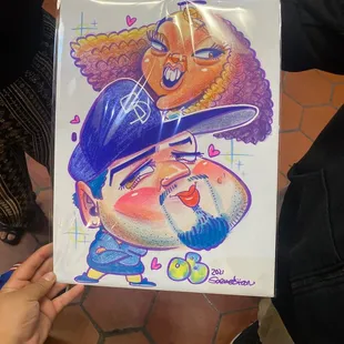 Saw this caricature shop on TikTok. Been wanting to visit for months now. Finally got to go down to SD and I'm happy we made the trip. It was a little difficult to find this cute little shop because there was an event happening on the street it was on. It's located inside a building with other little shops inside. Aaron and Saemee were great, I had no idea they were a couple team. It's a little scary to get a caricature done as POC, but I was relieved that Saemee was a POC as well haha. She really took her time to place the stickers and get the colors/details right - which we really appreciated. We were just chatting and looking around at all the artwork and it was a really chill vibe. At the end we decided to buy the clear cover, but there were also framing options which was nice. She also gave us free stickers! Overall fun experience if you're in the area. I hope they get more business.