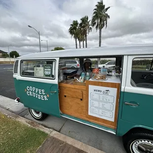 This cute aesthetically blue WV is parked by Laulani Community Park, I live in this neighborhood so I would drive by sometimes and just think what a cute little coffee spot! Lots of parking, I walked there since it's so close. The menu options have a variety of things, coffee, iced tea, espresso. They even had bakery goods to offer. The worker who I think is the owner is so friendly! So welcoming and made the drinks so fast! Had 2 people in front of us. I went with the cowabunga and banana bread which was really delicious.My mom had the good vibes tea which she enjoyed. They also had stamp card! Amazing. Everything about this business is so cute. The only thing is for me the drink were a little small. The biggest size is 16, but I'm a venti girly which is 24 oz.