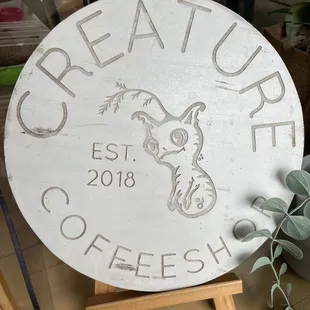 a cup of coffee and a sign