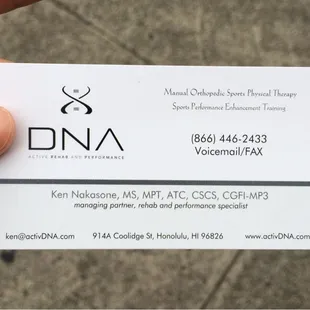 A very weird turn of events lead me here- a conversation with one of my clients visiting Oahu about how I walk with a slight lilt (think small hops when walking), him happening upon Ken who works here at DNA, my client calling my workplace and leaving Ken's info for me, I run a 5k and get tendinitis in my ankle and referred to get physical therapy and BAM! Here I am getting treated! All within 2 weeks time of each other!I'm very happy to have met and worked with Ken. I've seen him 4 times (I have 12 sessions prescribed), and my tendinitis is pretty much all gone. Just a tiny bit of stiffness left in my leg/ankle. He is a very warm and professional physical therapist, and time flies by every whenever I see him. The first visit he was very thorough in checking out my ankle, posture, how I walk etc. He was even able to "read" my flip flop and tell me all about how I walk just from how the shoe was worn down! Incredible! Every time I go, he massages my leg, compressing and stretching it to loosen it up. He also has me do different stretches and exercises to further mobilize it. Very effective practice!I've learned so much about myself and have so much more awareness! He's even given me tips on how to further improve in my performance skills (light contortion), which is another one of his specialties! I definitely recommend him for both recovery and enhancement of present athletic skills! AND he works with kids and adults alike! What are you waiting for? Go see Ken!!