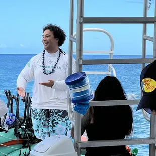 Brandon and Zoey prepping the boat for snorkeling.