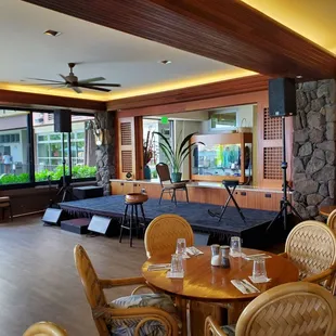 Great location and views right on the ocean.They do have live entertainment and a dance floor.Stormy during my stay in Hawaii so our table right next to the ocean didn't work out.Huge wave came over the railing and soaked us.Staff was extremely accommodating and quickly moved us. All staff was great.Food was just ok, desserts were very disappointing.Everything was quite over priced for what you get