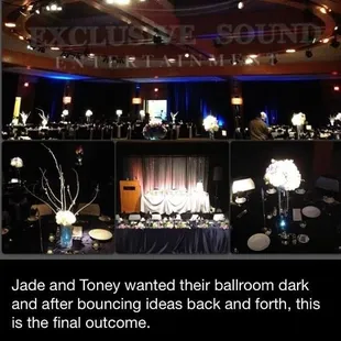 Exclusive Sound Entertainment (ESE) WILL make your vision come to reality. I have the honor to say that my husband and I hired ESE for our wedding day just this past Saturday 11/10/12 ;).ESE was with us every step of the way. EVEN before we decided to hire them. Ben Bautista, I have to say, is very professional and knowledgeable of lighting, DJ, weddings in general. I swear he should be a wedding planner!!! He has a lot of resources and thanks to him we were able to find a vendor for drapes, a vendor for a white customized dance floor, a vendor to pin spot our centerpieces, and to utilize him for DJ, uplighting our ballroom and not only that...our cake and champagne table, our head and sweetheart table, heck I think he even lit up the pupu area... etc. He also worked on getting us motion lighting for our grand entrance and our first dance (our room was a dark theme). To top it off....he also used fog/dry ice during our first dance to make it seem like we were dancing on clouds... I will post pictures!!!Ben you are awesome and hilarious even if you don't know it! lol. thanks for making our day spectacular. I had many compliments saying that it was such a "David Tutera" wedding. lol. you help make it possible!!!!sincerely,Jade and Toney