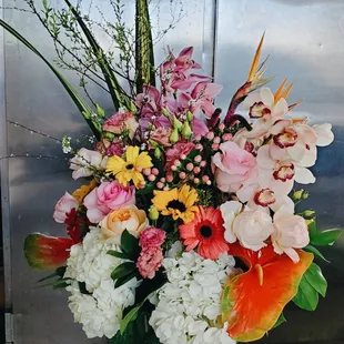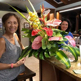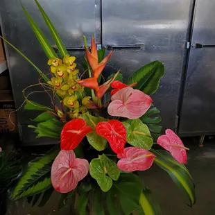 I was thoroughly impressed with the care and consideration this mom and pop flower shop provided me. I definitely felt the aloha (even though I ordered by phone from the mainland). I ordered a large tropical arrangement to be delivered to my auntie's in Kahala. We spoke briefly on the phone and discussed price. I agreed to $100 for the arrangement and then the delivery was around $10. I think in total around $115 after tax. I did ask for a photo of the arrangement once they were completed with it too.Wow! I have never seen such a beautiful arrangement before. My auntie was delighted and it made her so cheerful! I'll definitely order from them again. Great services from beginning to end. The only downside to this shop is that they are not also in the mainland with me! Mahalo again to Flowers & Fun!