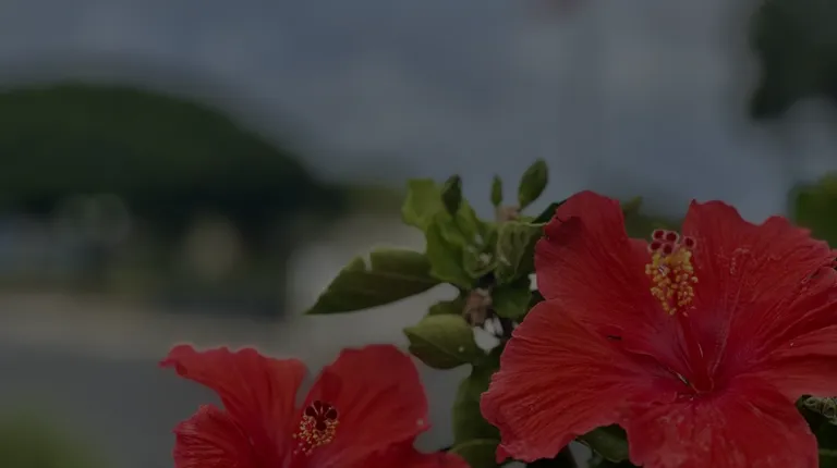 Hibiscus flower in front of the USS Oklahoma Memorial at Pearl Harbor on Oahu, Hawaii.