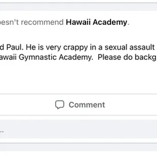 Our kids just started taking lessons at Hawaii Academy on Pearl Harbor this past month, and my 7 year old son's instructor, Mr. Paul, out of no where during their class told my son that he's ugly, and the only reason his mom tells him he that he's handsome is to make him happy.I get that older generations, generally men, try to be funny by teasing, and he may not have meant any harm by it. But my son doesn't know this teacher well at all yet to understand his "humor" and we don't talk like that to each other in our family. Our son said he felt really embarrassed and caught off guard by him saying that in front of his class. He has adhd and intense RSD, and we signed him up for these classes to work on building his self esteem and confidence. We've talked to him about how other peoples words don't matter, and to ignore other kids if they're rude. We told him how some people don't know how to be funny without making jokes at the expense of others, and that is only representative of them, not him. I feel like it's a weird situation because it's an adult instructor though, not another child being rude in this scenario.My husband talked to their management and was told that they would be dealing with it, and our son is in a different class with a different instructor now. My husband also asked Mr. Paul about it in person when he saw him at the gym. Paul didn't apologize, but snickered at him about it.I was really hesitant to talk about this, and was worried I may have been overreacting, but after talking with a few other parents with children who have attended classes with Paul- this is unfortunately not an isolated negative incident that occurred only with our son. Other parents have made complaints about him being inappropriate with their children as well. I don't want to speak on behalf of other parents' experiences though and hope they're willing to share them here too. There is also a review on their Facebook page from 2019 that says "There was a coach named Paul. He is very crappy in a sexual assault way to little girls. That is why we stopped going Hawaii Gymnastic Academy. Please do background checks of your staff."I just wanted to post this to let other parents who may have felt bad vibes from this instructor know that they are not alone. It really worries me about how many children may have reported feeling uncomfortable with him over the years, considering he still works there with access to children as young as 3 years old. I'm not sure if drop off/pick up events have opened back up at this branch, but there's not a chance that I'd ever feel comfortable leaving my little ones there alone there under his care. If he speaks like this to children openly and comfortably during class where their parents are present in the building, I cannot imagine how he behaves when parents are not there. I cannot speak to the sexual assault suggestion made about him on their Hawaii Academy's Facebook reviews from 2019, but had I seen that review prior to signing our kids up for classes there, there's no chance we would have let our son be placed in his class. It looks as though their reviews on their Facebook page are disabled now.Our younger daughters (3 and 5 years old) have had wonderful instructors there, and the front desk employees are so kind and sweet. I don't mean to bash this place as a whole. I was really hoping that it was just a miscommunication because we were so excited to sign up there for classes. The location, available classes, prices, and other instructors are great. However, what occurred was not a miscommunication, and there seems to be a pattern of inappropriate behavior with Paul.I will update here on how this situation is handled.