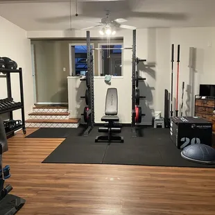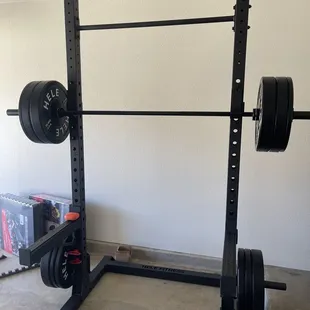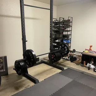 Squat rack, barbell, plates, and mats