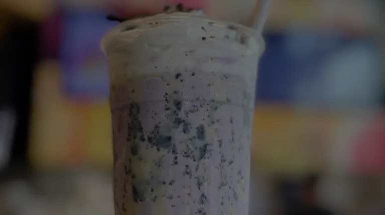 a woman holding a cup of purple ice cream