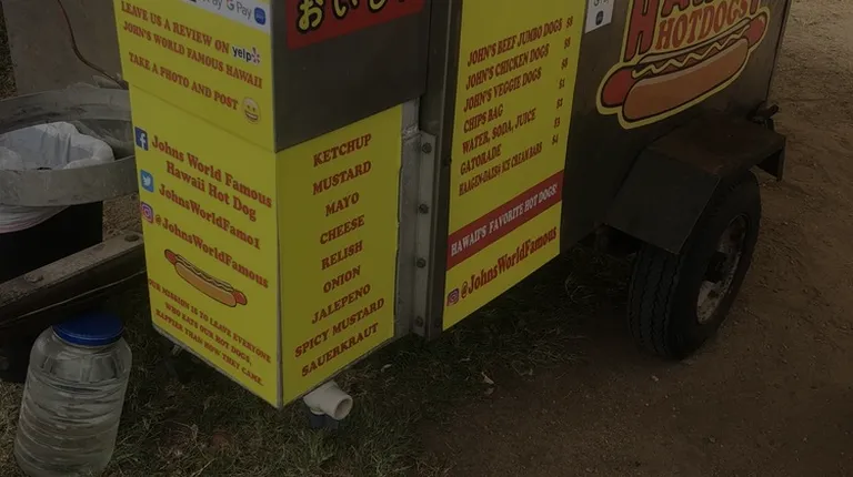 John's hot dogs are hands down THE BEST! We were disappointed on our recent visit to Oahu to find that Frank's Haute Dogs is closing. John's is a true find! His dogs are superior to Frank's. He has excellent customer service. Buy a dog and enjoy the beach! You'll want to come back I promise!