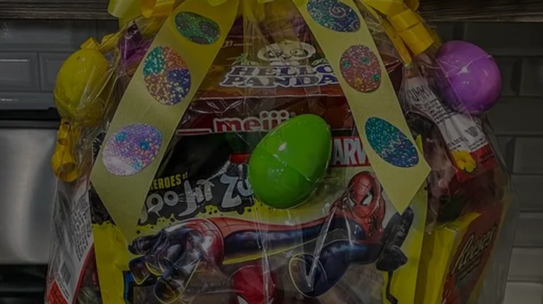 a basket of food wrapped in plastic