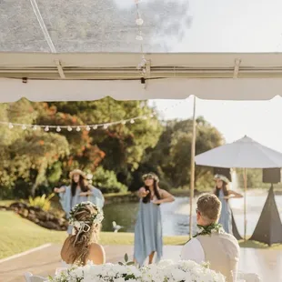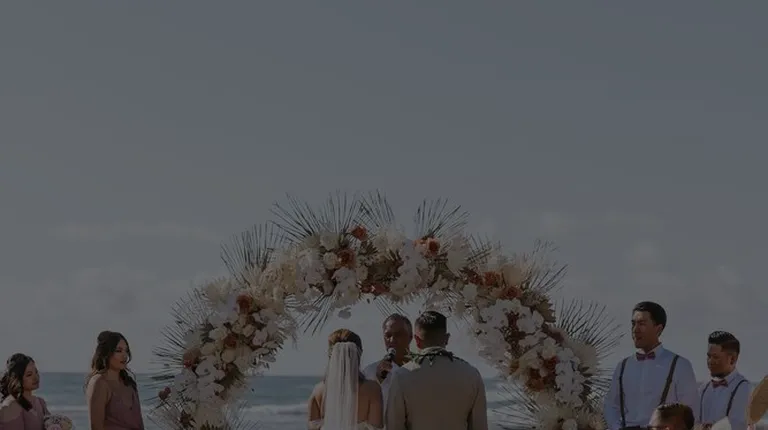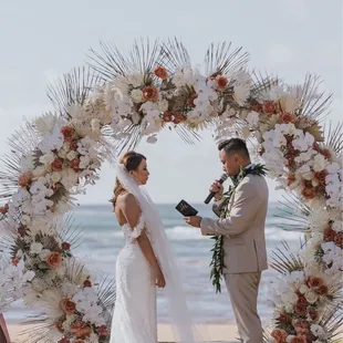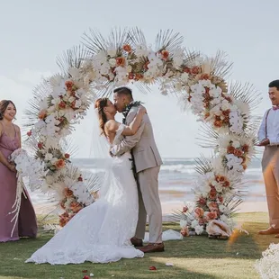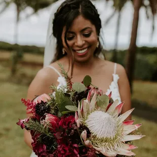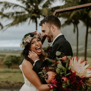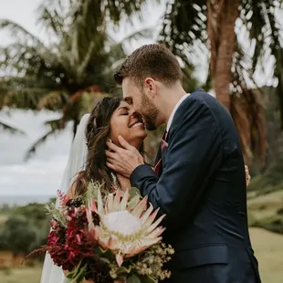 Love Note from the BRIDE:Nick and I planned a destination wedding for 115 of our closest friends and family. While I was hoping for sunshine, planning for a possible light sprinkle... what I, our guests, and our vendors did not plan or expect.. was for-- was a MONSOON on our wedding day! I don't mean to say it just rained... I mean, it literally POURED. There were even flash flood warnings! Every single guest and vendor was drenched from head to toe. They say rain on your wedding day is supposed to be good luck, and ours started this day with our vendors.Vanessa and the entire La Flor team, I don't even know where to start, except by saying THANK YOU, THANK YOU, THANK YOU!!!!You worked in the rain to set up our beautiful altar, and YOU MADE ALL OF MY FLOWER DREAMS COME TRUE!!From the moment I met Vanessa, we instantly clicked, and I knew she was going to be the only person I would trust to bring my flower vision to life, AND SHE DID NOT DISAPPOINT!!I sent her my Pinterest and inspiration, we discussed flowers, colors, and my overall vision for the space, and I left it up to her creative mind to do the rest! She worked with my wedding planner Carly through the finances and smaller details, but I honestly have no words to express just how THANKFUL I am to have met her!! And a HUGE shoutout to Leila @Kualoa Ranch who referred me to her! WHAT A BLESSING!Because our venue was remote, the first time I would see everything, including the altar, my bouquet and my flower crown, was at the venue... and OMG, I was speechless. I was in love and over the moon with EVERYTHING her and her team touched!!! The monstera leafs, the large dahlias, and of course, THE KING PROTEAS, my ABSOLUTE FAVORITES!! I was practically in tears with how overjoyed I was.FLOWERS MAKE SUCH A HUGE DIFFERENCE on a wedding day!!!My bouquet was so perfectly unique and beautiful. It was wrapped in ribbon and it was romantic and bold all in one. I was SO excited post-ceremony to switch from my veil to my FLOWER CROWN which matched my bouquet perfectly!! It was absolutely stunning. I felt like a queen all night!!Overall, from initial reach out and partnership with our wedding planner Carly, to planning, prep, execution and even follow up afterwards, our experience with Vanessa and the La Flor Team, was EXCEPTIONAL! I would 100% recommend!!!My only regret, is not being able to bring ALL of my florals back to the mainland with me. I had to leave them on Oahu, and that was heartbreaking!! VANESSA WE LOVE YOU!!!!Love Note from the Groom:Vanessa did such an amazing job on everything! The flowers on the arch were arranged and designed so perfectly, the bouquet literally made my wife cry when she saw it, and all the floral decorations on the tables and around the tent were gorgeous. We even added two last minute groomsmen and Vanessa made two new PERFECT boutonnières in literally 5 minutes flat. I was so impressed with her preparedness and flexibility, not to mention how accurately she captured my wife's vision. AMAZING!