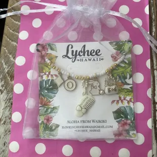 The sweet things you'll find here are the fun accessories...Located in Duke's Marketplace Lychee Hawaii is one of several carts you can find right along the parking garage for Ross near the food trucks and let me tell you it will stand out.From the owner itself is so spectacularly energetic and will to help you create that special piece to the extent of providing chairs so that you're able to decide at your own pace and leisure which I was so excited to have found this place knowing that is a great option and wonderful deal to be gifting friends something fun and personal that was made in Hawaii by a woman owned and operated business.She does have Instagram @lychee_hawaii as I do make jewelry myself but do love to support local this place is truly lovely a unique place to find your bling.Thank you!