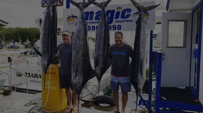 I went out on this boat with my wife and her parents this past Tuesday. We had booked the full day exclusive charter +2 hours months in advance and met the crew at the harbor in Honolulu while it was still dark outside. Russell was the captain and a very nice but somewhat quiet guy. In addition to him we also had two deckhands on board to help with the fishing. The boat itself is a 50' Pacifica Sportfisher Yacht which had enough room outside for fishing and then had 2 bedrooms and plenty of space inside as well.After getting on the boat Russel asked us if we wanted to target the big guys or schools and we choose schools. After that we quickly headed out of the harbor and got our safety instructions and demonstrations. Our first stop was to find some bait balls and get some mackerel on board as live bait in case the lures were working on that day. The fishing for the makeral was to be done by the deckhands and while they pulled up a few fish, it was obvious that Russell wasn't happy with how they were biting for the day. I assumed it to be a bad omen but thankfully that wasn't the case. We eventually got to one of the places that he had targeted and with the live bait we quickly pulled up 11 Mahi Mahi one right after the other. It was like a game of musical chairs in the fighting chair because as soon as one was on the boat another was ready. They weren't exactly the biggest fish (maybe 8-14 lbs) but it was really nice for everybody to catch something. Once that was done we started going after the bigger fish for the day. Quickly after all the Mahi Action we had a Blue Marlin bite but he quickly got off the line. Thankfully not too long after that we got another bite and this one I was able to bring in. After a short but entertaining fight (I was on a lighter reel), we had the marlin on the boat (they already had a buyer lined up). It ended up being a 120 lb marlin and was absolutely massive. At this point we were maybe half way into our charter but things got a lot slower through the rest of the day. Even though we had already caught a ton of fish, the crew was constantly changing the lures hoping to get us that second marlin for the day. We only ended up having one more Marlin on and it got off the hook before we were able to fight it. Still, we stayed out for around 10 1/2 to 11 hours trying to catch that second marlin even though it never did happen. Whenever we got back to the dock we were able to hang up all of the fish and get photos with all of our catch. Even though in Hawaii the boat technically owns all of the catch and didn't have to share any with us, Russell ultimately allowed us to have the filets from two of the smaller Mahi Mahi. That was enough for two meals for our group of 4 and it was greatly appreciated.The bottom line for me is that I would recommend Magic Sportfishing to anyone looking for a good fishing charter in the Honolulu area. Russell and his crew were fantastic and all of us on the boat really had a great time!