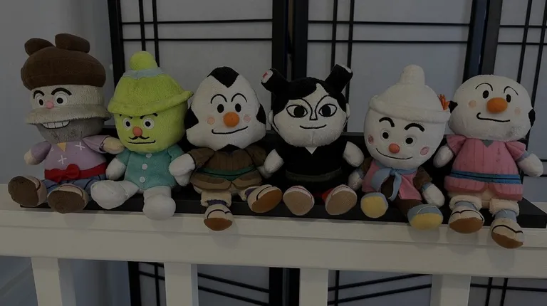 a wooden table with stuffed animals on it