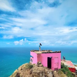 One of the many hikes on Oahu with a rewarding view. Parking isalongside the road. There isn't an exact entrance to the trail, you'll just notice dirt on the sidewalk from hikers coming down, that's a sign you're at the entrance. This is my 2nd time hiking Pink Pillbox. I would say it's an easy trail with some steep inclines that can be considered moderate. Families come here with their little children but be cautious when bringing kids, one wrong step and you slip could be very dangerous. This hike is pet friendly as well, seen plenty of hikers with dogs. Took us 45 minutes to get to the top with some breaks in between and 30 minutes down. Going down is a lot easier and you could get down in 20 minutes at least. The view at the top is incredible. There are about 4 bunkers up top. Standing on top the bunkers gets you an amazing view of the ocean. Very nice and rewarding especially when it's windy, the air cools you down after all that incline walk and sweat.