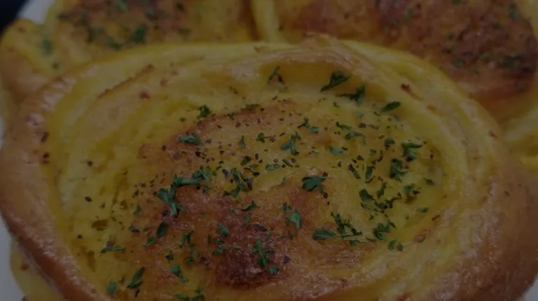"Roast Beef N Cheddar" Roast beef & cheddar baked in fresh bread. Topped w/horseradish mayo and chives